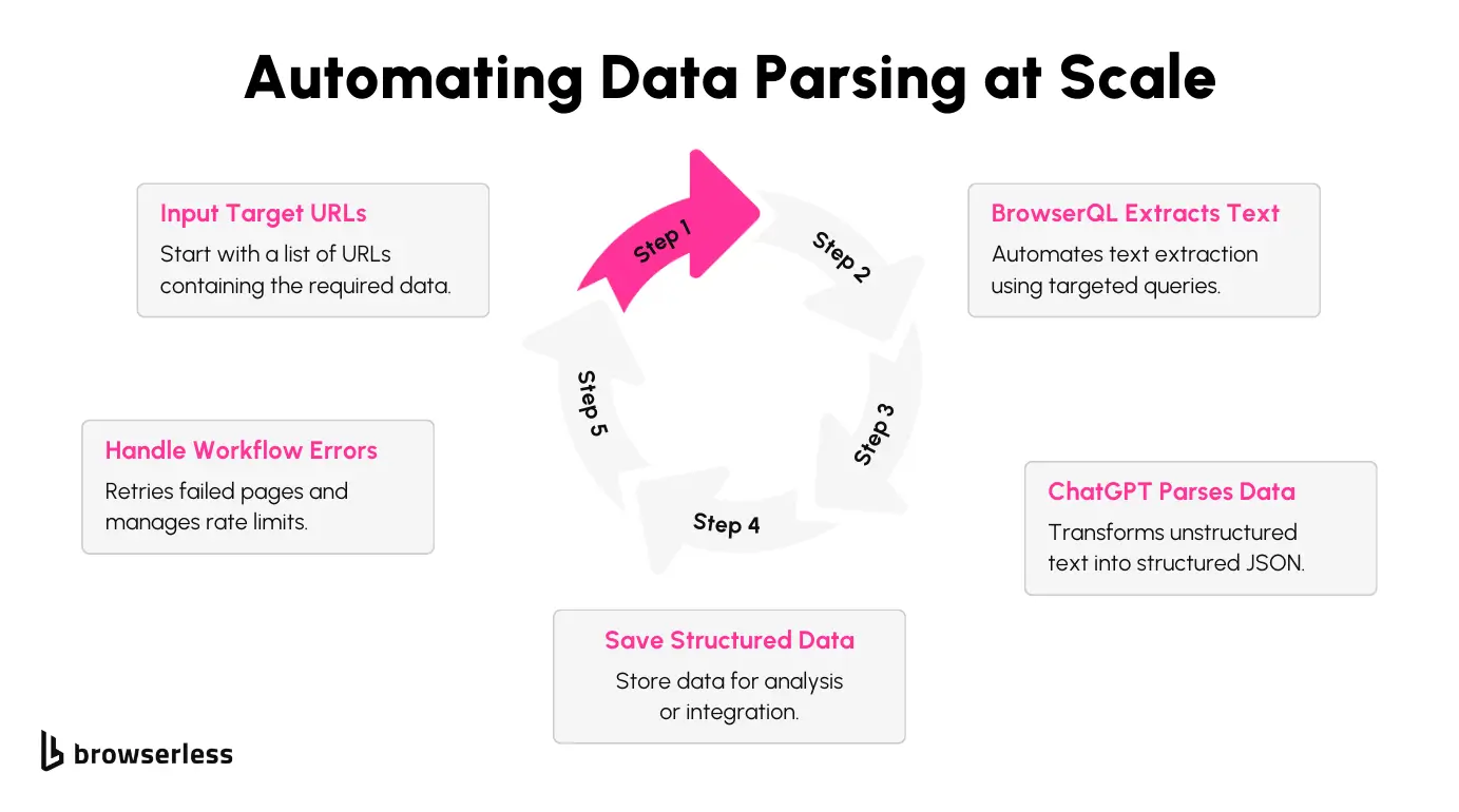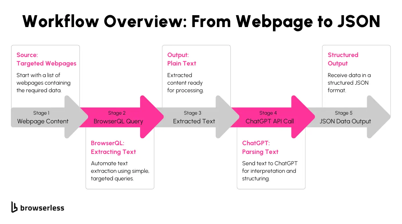 Let’s break down how BrowserQL and ChatGPT work together to seamlessly automate web data extraction and parsing. This step-by-step process takes you from raw web pages to structured JSON outputs, making it straightforward to integrate into your own projects.