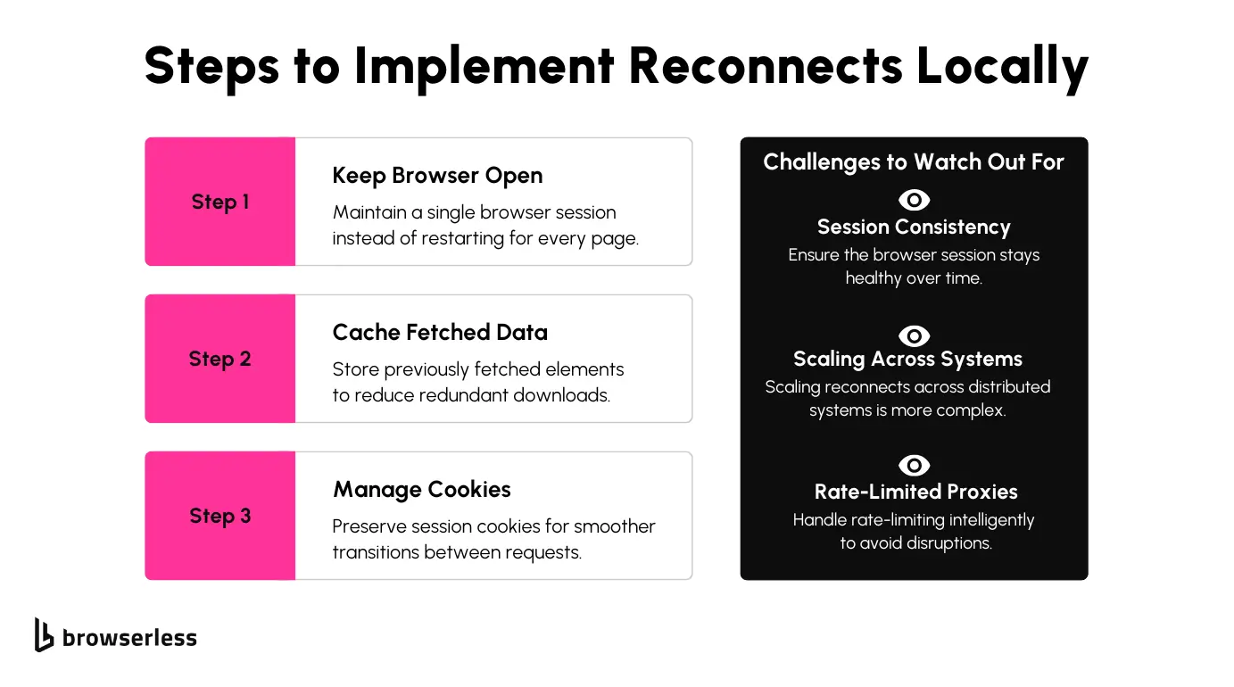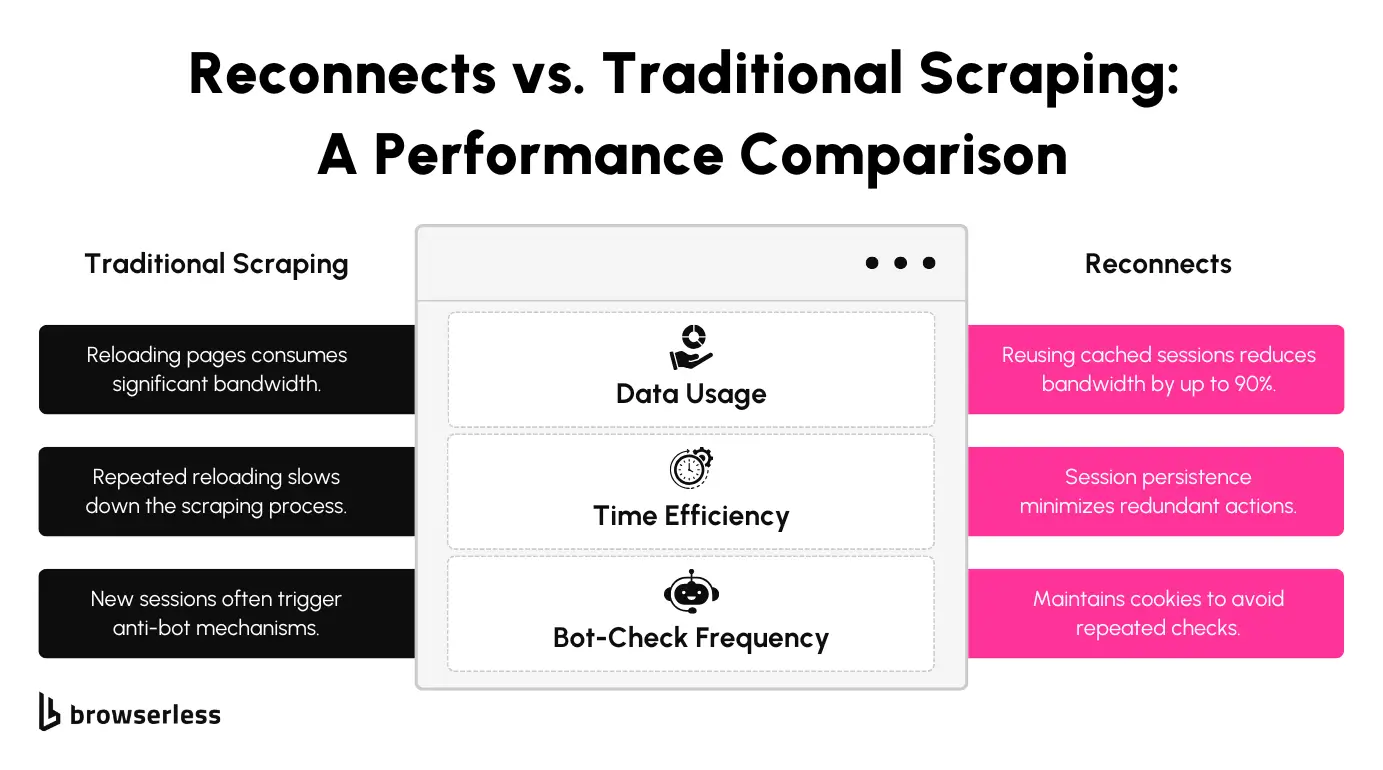 Reconnecting lets scrapers reuse an active session instead of starting fresh each time, saving bandwidth and avoiding repeated logins. BrowserQL's reconnect API keeps sessions open, minimizing proxy requests and reducing detection risks.