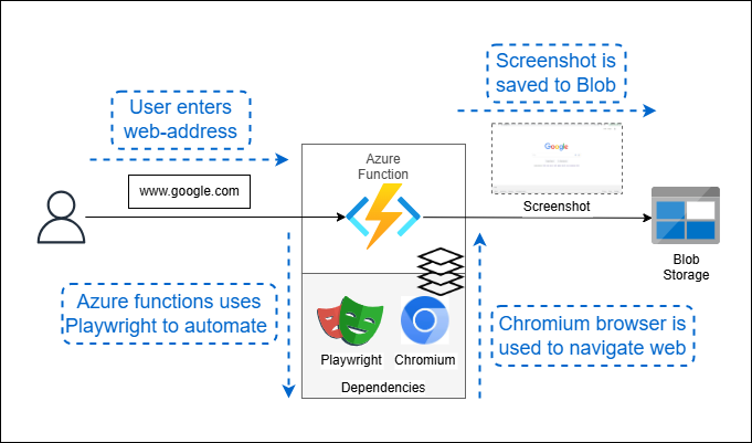 In this case, we'll design a function that takes a screenshot using Playwright and uses a website's URL as input. The function visits the website, captures a screenshot, and saves it to a blob storage.