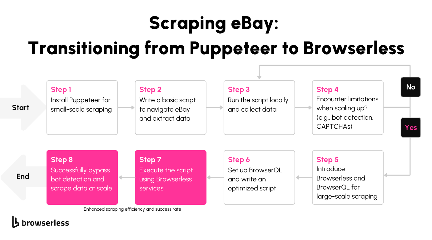 Scraping eBay at scale comes with challenges, but tools like Browserless make it manageable and efficient. While Puppeteer is great for small projects, scaling up requires the advanced features and anti-bot capabilities of BrowserQL. From handling complex detection systems to providing human-like interactions, BrowserQL streamlines the entire process. If you’re ready to take your scraping projects to the next level, give BrowserQL a try today.