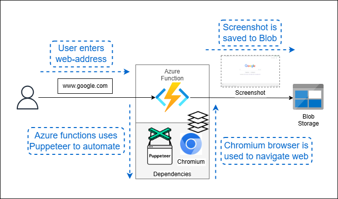 Using puppeteer-core and a separate Chrome browser, the function will visit the provided website, capture a screenshot, and save it to a blob storage. This process helps us check if the function works.