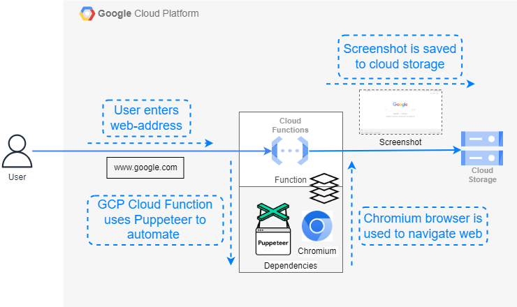 If there's no input, the function defaults to taking a screenshot of "google.com." Once the function executes successfully, the screenshot is stored in Google Cloud storage within a designated bucket.