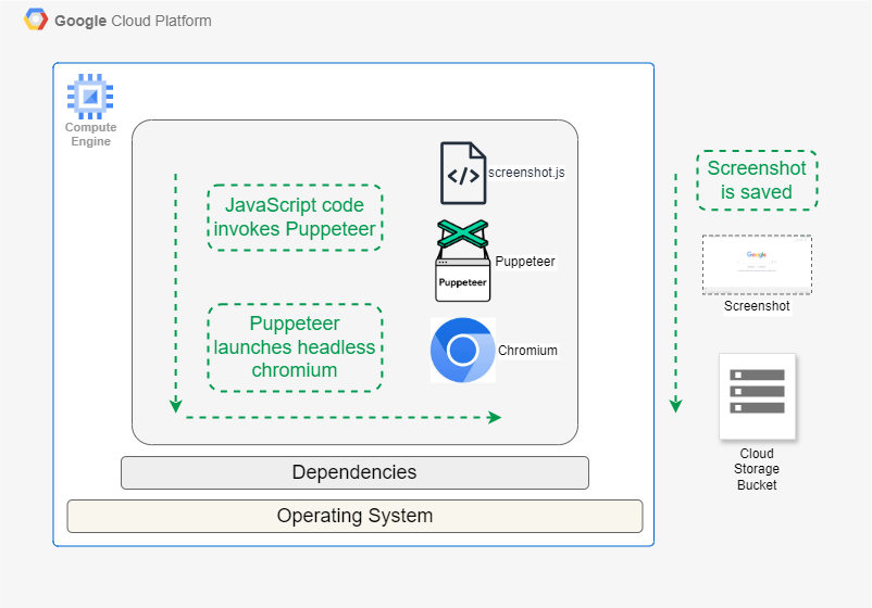 The following code takes the website URL as input, captures a screenshot and saves it to the Cloud Storage bucket.