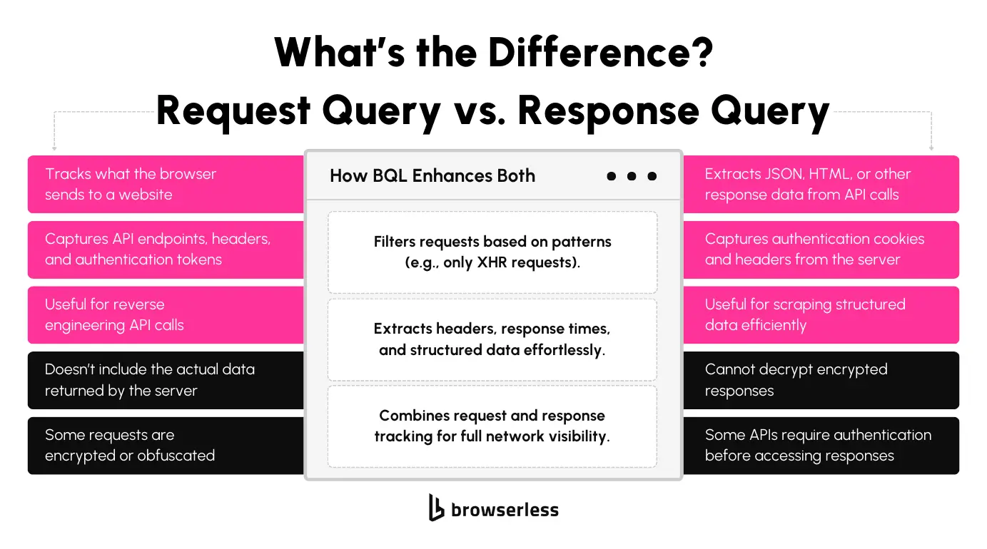 Request queries capture the details of outgoing network requests, such as URLs, methods, headers, and payloads. Response queries, on the other hand, retrieve the data returned by the server, including JSON, HTML, and binary files, allowing you to access the actual content being loaded by the browser.