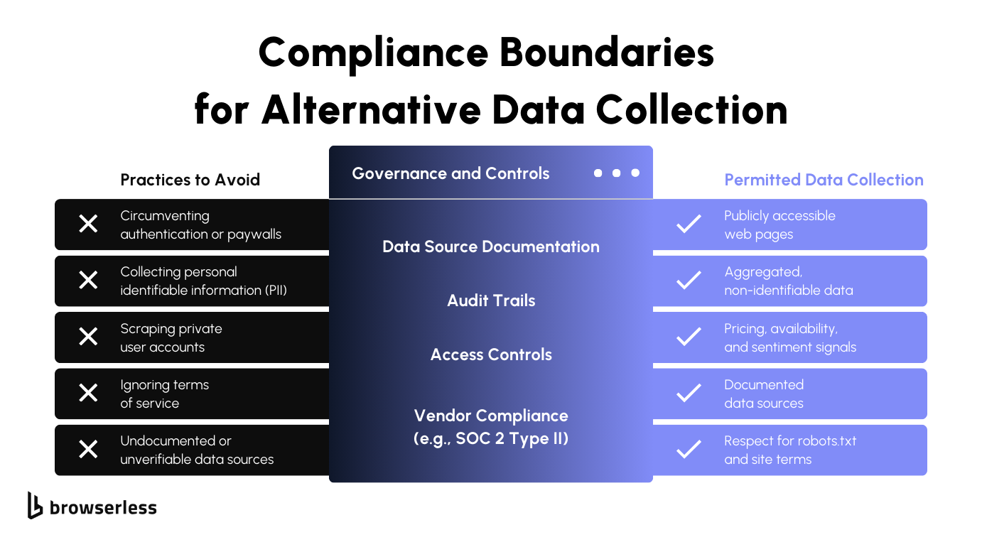 Alternative data production pipelines also need clear boundaries. Collecting public data and respecting site policies helps reduce legal and reputational risk, especially in regulated environments.