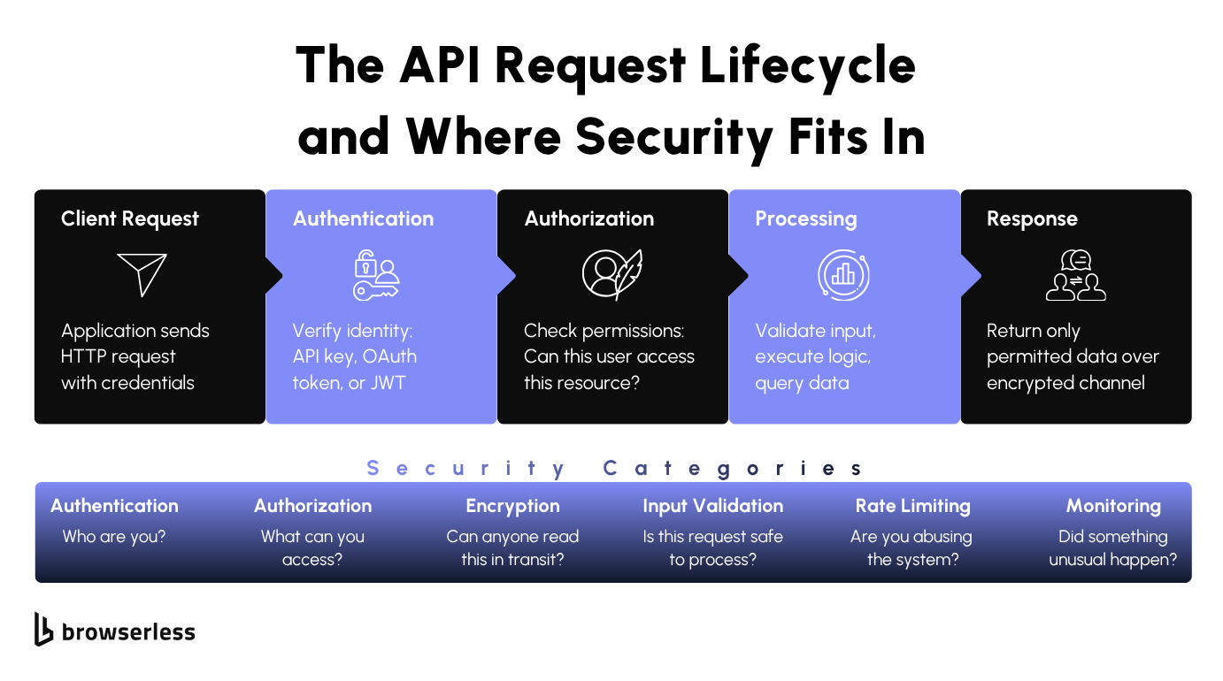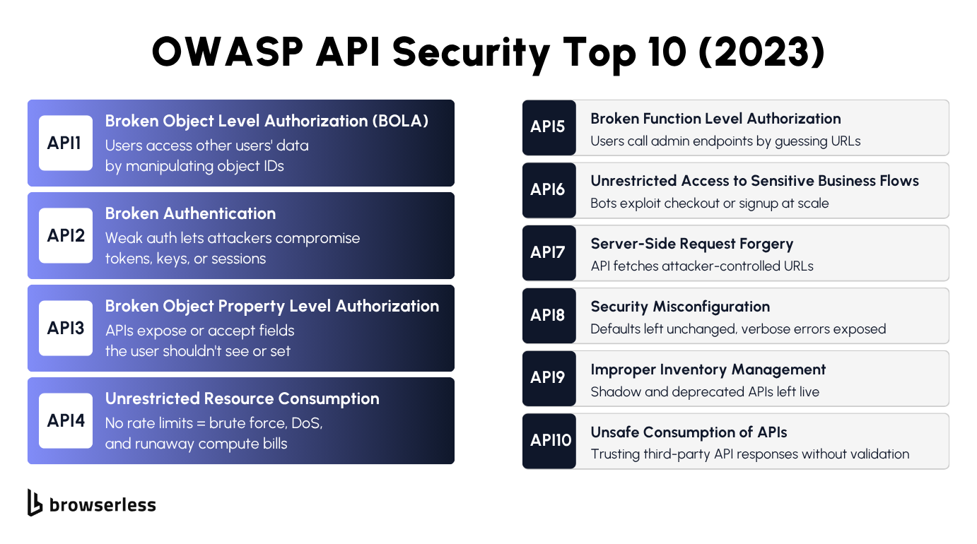 Every API you expose is a surface attackers will probe, and roughly 80% of successful API attacks come from authenticated users exploiting missing object-level authorization checks. The difference between a secure endpoint and a breached one usually comes down to whether authorization is properly verified on every request. This guide covers the full OWASP API Security Top 10, the defenses that actually work, and how Browserless applies them to secure browser automation at the API level.