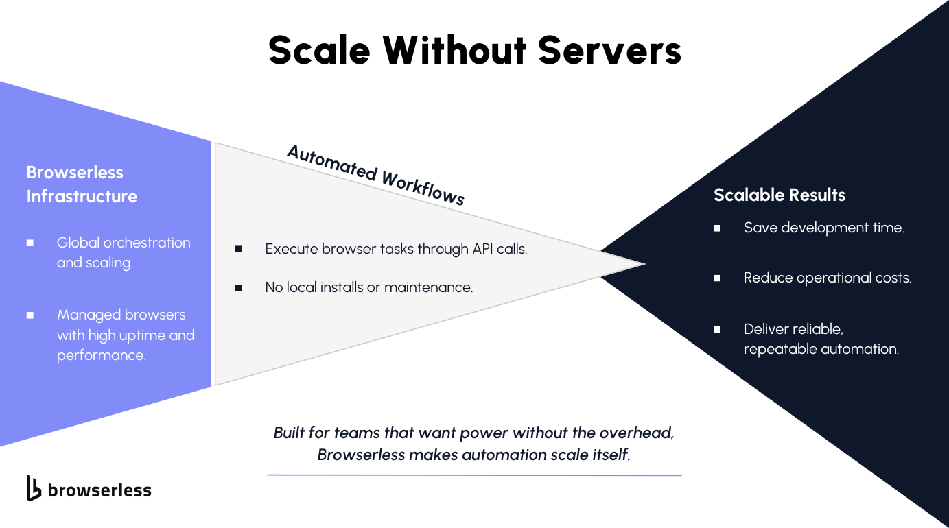 Since Browserless manages the browser, teams do not need to maintain their own scraping infrastructure. They can focus on working with the data rather than troubleshooting browser issues or worrying about environment differences.