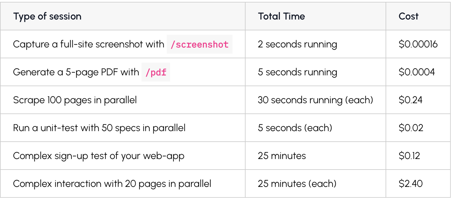 Type of sessionTotal TimeCostCapture a full-site screenshot with /screenshot2 seconds running$0.00016Generate a 5-page PDF with /pdf5 seconds running$0.0004Scrape 100 pages in parallel30 seconds running (each)$0.24Run a unit-test with 50 specs in parallel5 seconds (each)$0.02Complex sign-up test of your web-app25 minutes$0.12Complex interaction with 20 pages in parallel25 minutes (each)$2.40