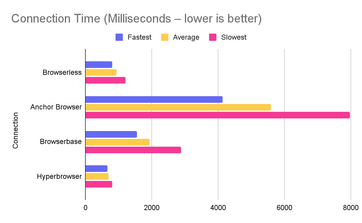 Browserless averaged 936.4ms to connect vs. Anchor at 5,582.4ms.