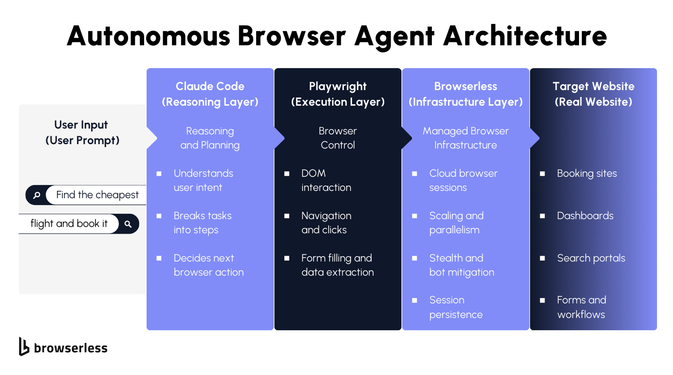If you’ve been building agentic systems, you’ve probably noticed the gap between what models can reason about and what they can reliably execute on the web. Many high-value workflows live inside dynamic, authenticated sites where APIs fall short, pushing agents into real browsers. That’s where challenges surface: unpredictable session lifetimes, parallel runs, shifting page state, and constant bot detection. In this article, we’ll explore why browsers are unavoidable for autonomous agents, how Claude Opus 4.5 and Playwright divide thinking and execution, and what it takes to run these systems in production, using Browserless as the infrastructure layer throughout.