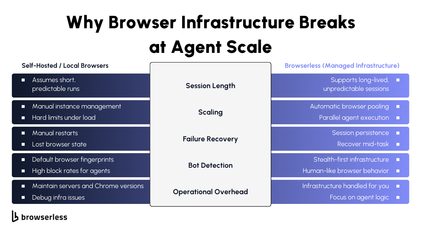 - Browser operations quickly become the bottleneck. Long-lived sessions, parallel execution, and bot detection are infrastructure problems, not agent-logic problems—and managed platforms like Browserless absorb that complexity, so teams can focus on building better agents.