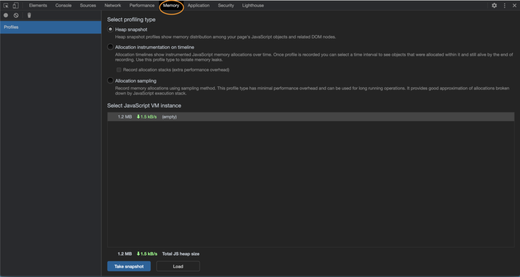 Down below, you'll want to click that "Load" button the bottom of the frame. What this does is allow you to load the existing snapshots we've made into Chromium's debugger. You'll have to do each snapshot individually, and renaming them is helpful so you know when they were taken. In our case, we had both start and end snapshots, so it made it easy for us to distinguish what was what.