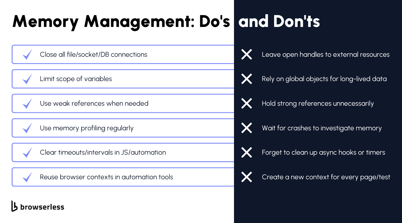 If you're performing browser automation at scale, especially with tools like Browserless, it's crucial to closely monitor memory and avoid creating a new browser or context for every test. Reuse whenever possible to keep your memory consumption in check.