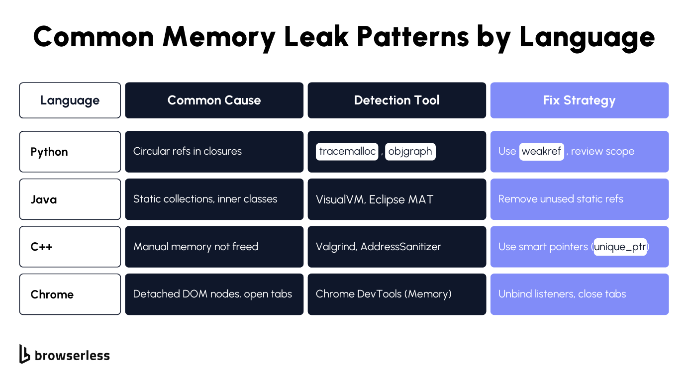 Memory leaks don’t play favorites; they can happen whether you're writing Python scripts, scaling Java services, building in C++, or just running a few tabs in Chrome. However, the way leaks appear (and how you track them down) depends significantly on the language or platform you're using.