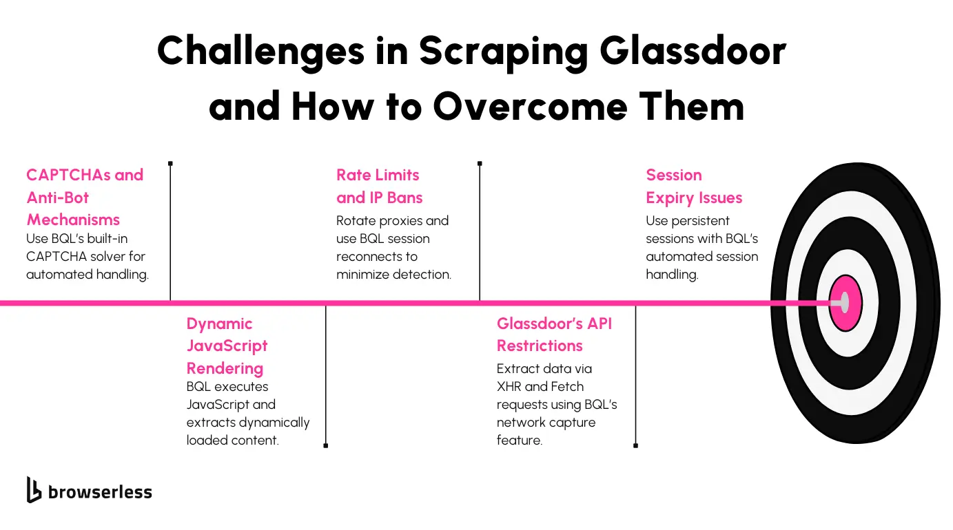Scraping Glassdoor with Puppeteer can provide valuable data, but several challenges can slow down or block your efforts. These limitations range from anti-bot measures to technical hurdles when scaling up the scraping process.