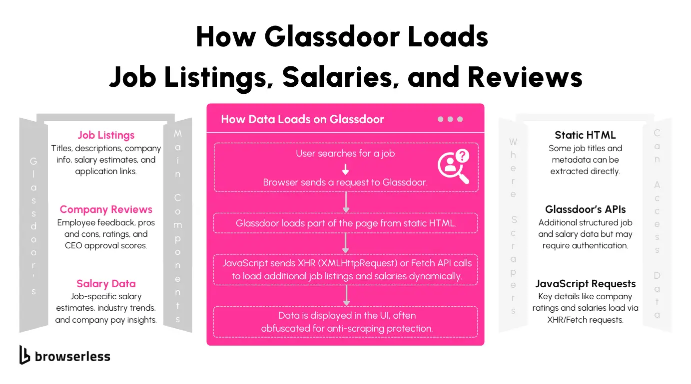 Many sections of Glassdoor, like salary details and company reviews, are loaded dynamically using JavaScript. Scraping these elements means waiting for the full page to render and executing scripts to access the complete content. If you do not handle this properly, you risk missing critical data or pulling incomplete information.