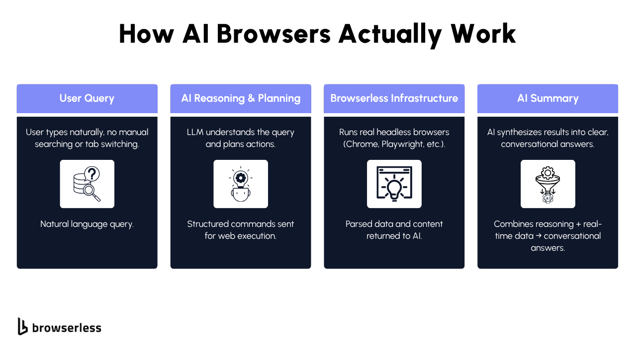 AI browsers are changing the way we use the web, making browsing feel smarter, faster, and more natural. They blend language models, automation, and real-time intelligence so it feels like you’re working with an assistant, not just a tool. Browserless isn’t an AI browser itself, but it gives developers everything they need to build their own helping AI safely load pages, interact with sites, and actually get things done online. If you’re building your own AI browsing experience, give Browserless a try. You can sign up for a free trial and see how easy it is to give your AI the power to see, think, and act on the web securely and at scale.