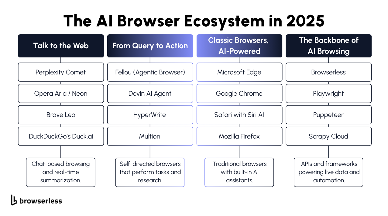 Browsers are rapidly evolving from static tools into intelligent assistants that can search, summarize, and automate actions across the web, much like how Google revolutionized online searching. New AI-powered browsers like Perplexity’s Comet, Opera Aria, Brave Leo, and Fellou are leading this shift by combining large language models with real-time web access to deliver conversational answers, generate insights, and perform automated workflows. In this article, you’ll learn how these next-generation browsers work, what makes them different from traditional ones, and how the underlying technologies like automation, scraping, and cloud browser APIs are shaping the future of intelligent web interaction.