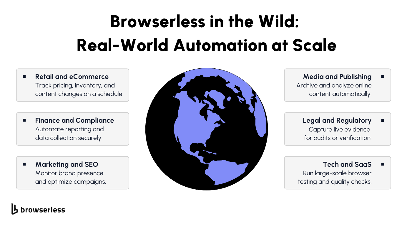 People use it for price checks, stock tracking, saving screenshots, creating PDFs of dashboards, watching competitor websites, and capturing news or research pages. These tasks need a stable browser, and Browserless provides that without extra work.