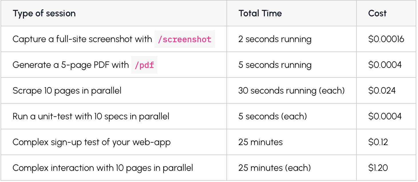 Type of sessionTotal TimeCostCapture a full-site screenshot with /screenshot2 seconds running$0.00016Generate a 5-page PDF with /pdf5 seconds running$0.0004Scrape 10 pages in parallel30 seconds running (each)$0.024Run a unit-test with 10 specs in parallel5 seconds (each)$0.0004Complex sign-up test of your web-app25 minutes$0.12Complex interaction with 10 pages in parallel25 minutes (each)$1.20